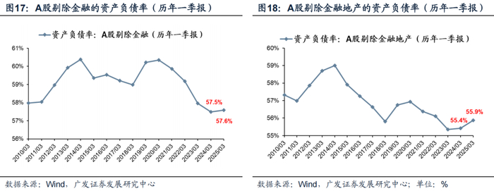 剔除季节性扰动,25年一季报A股非金融的资产负债率底部企稳,非金融非地产企业的资产负债率小幅回升。当前资产负债率已是2010年以来的相对低位,企业去杠杆的阶段逐渐过去。