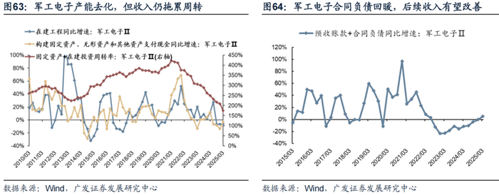 例如25年一季度军工电子,投资现金流和在建工程增速均到达历史低位,但收入仍未改善拖累了产能利用率回落。不过25年Q1军工电子的订单(合同负债+预收账款增速)显著改善,预示着后续的业绩表现。