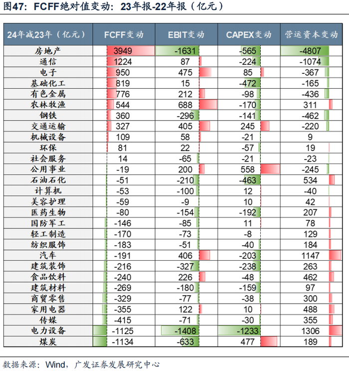 自由现金流改善最多的行业显示,传统行业改善主要依靠营运资本支出减少,而新兴产业主要依靠EBIT增加。