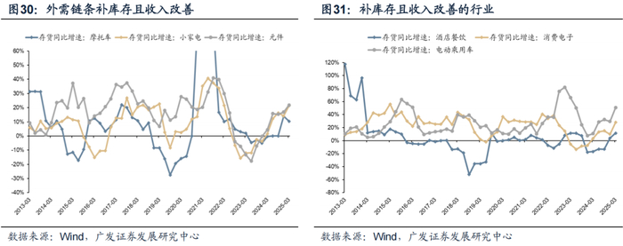 在此背景下,能维持结构性主动补库的行业集中在:外需链条(摩托车、小家电、元件、黑电、通信设备等),政策刺激相关的(酒店餐饮、消费电子、电动乘用车),部分资源和材料(能源金属、小金属、化学制品、非金属材料)等。