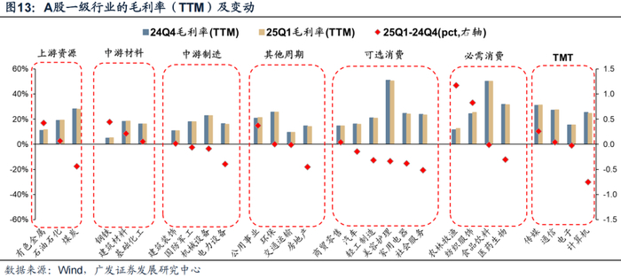 下游TMT与必需消费结构性恢复:社服、家电、轻工、汽车等毛利率回落。TMT(传媒、通信等)与必需消费(农林牧渔、纺织服饰)呈结构性改善。