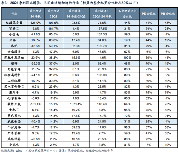 其中,一季报正增,已连续两个季度改善,基金配置分位数50%以下,PB分位数50%以下:船舶、贸易、券商、农化制品、塑料、水泥。