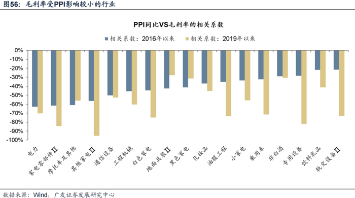 我们考察了分行业毛利率与PPI的相关系数,筛选成本端对于PPI较为敏感的行业:为了结果稳健,我们计算2016年(供给侧改革)至今,2019年(关税影响+双碳新周期)至今,两段区间二级行业毛利率与PPI的相关系数,筛选出和PPI负相关的行业。
