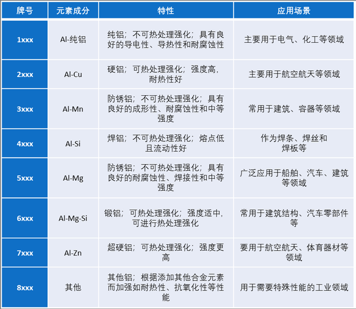 适用于通过机械加工(如压延、挤压)进行成型。根据是否可以通过热处理来增强性能,分为可热处理铝合金和不可热处理铝合金。可热处理铝合金如2xxx(铝-铜合金)、6xxx(铝-镁-硅合金)、7xxx(铝-锌合金)系列,通常用于高强度应用;不可热处理铝合金如1xxx(纯铝)、3xxx(铝-锰合金)、5xxx(铝-镁合金)系列,用于包装、建筑和海洋应用。