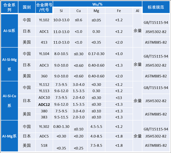 ADC12是我国铸造铝合金现货市场占比超七成的主流牌号,也是上期所铸造铝合金期货的交割标的。美国标准A383、中国标准相当于YL113。常见的铸造铝合金牌号有383Y.3、AD12.1、A380、AlSi9Cu3(Fe)等,其中,由于383Y.3和AD12.1化学成分接近,市场统称以上两个牌号为ADC12。