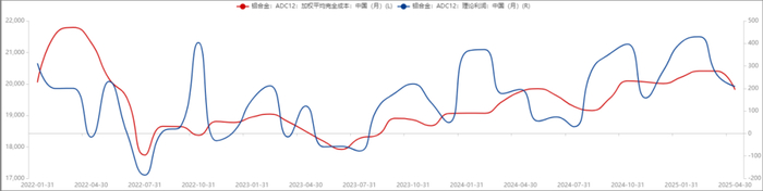 我国ADC12铝合金加权平均完全成本和理论利润(元/吨)