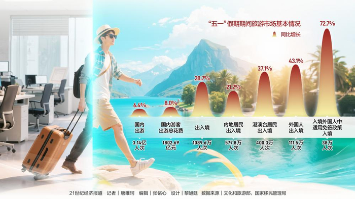 据文化和旅游部数据中心测算,2025年“五一”假期期间(5月1日至5月5日,下同),全国国内出游3.14亿人次,同比增长6.4%;国内游客出游总花费1802.69亿元,同比增长8.0%。