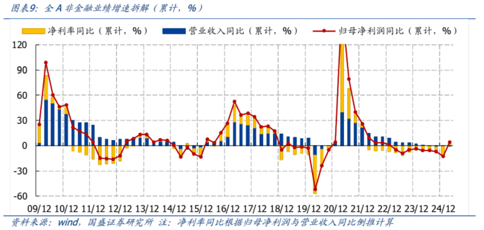 对业绩进行拆解,发现2025年一季度,全A非金融净利率同比正增4.54%,该指标2024Q4为-12.13%。绝对视角看,A股25Q1业绩增长的主要驱动为净利率同比增长;环比视角看,净利率同比出现明显修复,营收同比也有小幅改善。