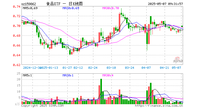5月7日,食品ETF(159862)开盘涨1.16%,报0.700元。食品ETF(159862)重仓股方面,贵州茅台开盘涨1.28%,五粮液涨1.09%,伊利股份涨2.36%,山西汾酒涨2.00%,泸州老窖涨0.84%,海天味业涨2.13%,东鹏饮料涨1.69%,洋河股份涨0.76%,今世缘涨1.47%,古井贡酒涨1.55%。