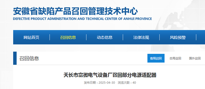 天长市富微电气设备厂召回部分电源适配器
