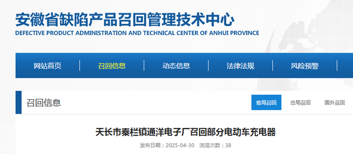 天长市秦栏镇通洋电子厂召回部分电动车充电器