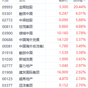 截至发稿,金辉控股(09993.HK)涨20.44%、中梁控股(02772.HK)涨5.88%、世茂集团(00813.HK)涨4.88%、绿城中国(03900.HK)涨3.78%、富力地产(02777.HK)涨2.97%。