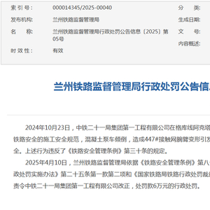 2025年4月10日,兰州铁路监督管理局依据《铁路安全管理条例》第八十九条第一款、《违反〈铁路安全管理条例〉行政处罚实施办法》第二十五条第一款第二项和《国家铁路局铁路行政处罚裁量权基准》附件第二类第15条较重阶次的规定,责令中铁二十一局集团第一工程有限公司改正,处罚款6万元的行政处罚。
