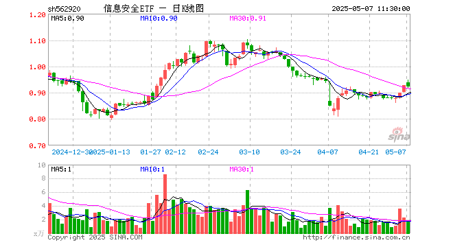 5月7日,截止午间收盘,信息安全ETF(562920)跌0.54%,报0.922元,成交额149.86万元。信息安全ETF(562920)重仓股方面,浪潮信息截止午盘跌0.88%,紫光股份跌0.58%,紫光国微涨0.20%,海康威视涨0.10%,中科曙光涨0.03%,大华股份跌0.68%,三六零跌1.56%,用友网络跌1.36%,网宿科技跌0.08%。