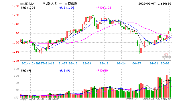 5月7日,截止午间收盘,机器人ETF易方达(159530)涨0.15%,报1.320元,成交额1.48亿元。机器人ETF易方达(159530)重仓股方面,汇川技术截止午盘跌2.34%,科大讯飞跌0.02%,石头科技涨1.32%,全志科技跌0.41%,双环传动跌1.24%,机器人涨0.00%,华工科技涨0.62%,中控技术跌0.62%,大华股份跌0.68%,绿的谐波跌1.43%。