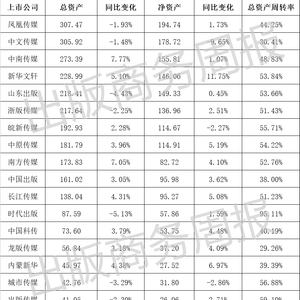 凤凰传媒、中文传媒、中南传媒继续位列前三甲。尽管凤凰传媒、中文传媒的总资产规模相比2023年缩水,但两者是唯二两家总资产超过300亿元大关的公司,分别为307.47亿元、305.92亿元。中南传媒以273.39亿元位列第三。
