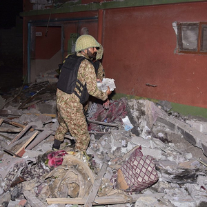 5月7日,军人在巴控克什米尔地区首府穆扎法拉巴德一处遭到空袭的地点查看损失情况。