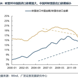 中欧产业链存在互补优势。(1)中国在传统制造业、新能源汽车和光伏等,已经形成了完整的产业链布局。欧洲在高端制造领域,例如精密仪器、航空航天、工业服务等,保持领先地位。(2)欧盟对中国的进口依赖越来越大、而中国对欧盟的出口依赖越来越小。