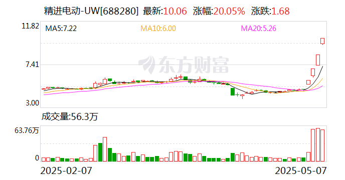 5月7日盘中科创板股精进电动-UW涨停,截至09:41,股价报10.06元,成交2.98亿元,换手率5.88%,振幅8.47%。