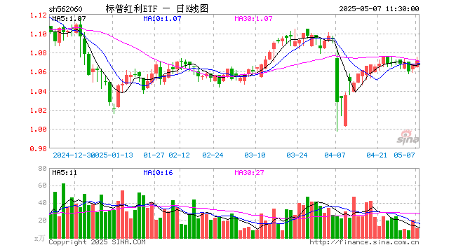 5月7日,截止午间收盘,标普红利ETF(562060)涨0.37%,报1.071元,成交额1200.56万元。标普红利ETF(562060)重仓股方面,华阳股份截止午盘涨1.06%,兖矿能源跌0.64%,潮宏基跌3.85%,平煤股份涨0.00%,厦门银行涨0.87%,华旺科技涨1.01%,上海银行涨1.26%,四川路桥涨0.11%,恒源煤电涨0.00%,中粮糖业涨0.21%。