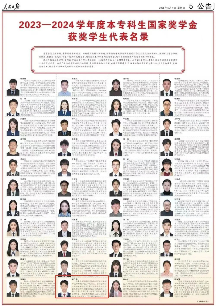 5月4日、5月5日《人民日报》专版刊登本专科生国家奖学金获奖学生优秀代表研究生国家奖学金获奖学生优秀代表经过严格选拔和评审全国共有12万名优秀本专科学生9万名优秀研究生荣获2023—2024学年度国家奖学金人民日报选登其中100名本专科生和100名研究生代表中南大学谢广阳、王峰2名学子上榜