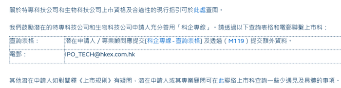 有意通过“科企专线”与联交所沟通的潜在申请人,可按照联交所“科企专线”网页上的说明联系上市科,将「科企专线-查询表格」、以及「首次公开招股前查询的补充资料(M119)」,发送到上市科提供的电子邮箱。