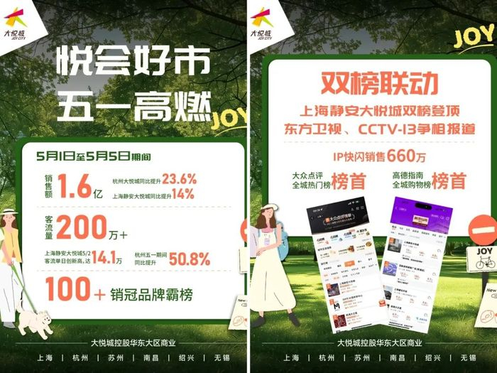 从部分公开数据来看,IP快闪活动的带动作用依然显著。大悦城官方数据显示,五一假期五天,大悦城在华东6城的7座购物中心累计实现销售额1.6亿元,客流量超200万人。除了上文提到的静安大悦城外,杭州大悦城在IP快闪的带动下表现也同样亮眼,整体销售额同比提升23.6%,客流同比大增50.8%。
