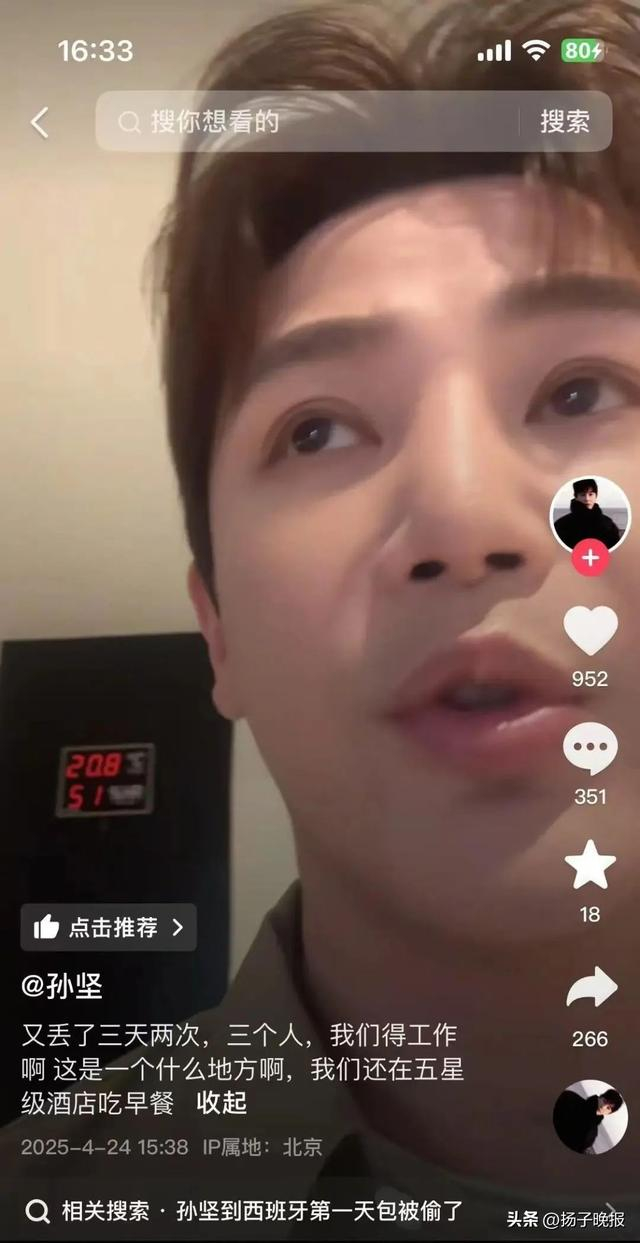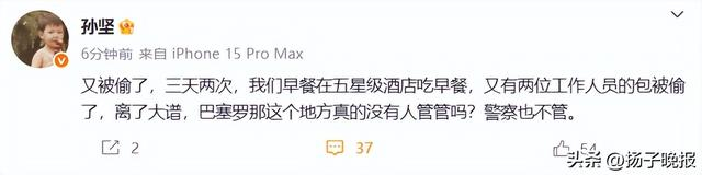 4月24日,孙坚发视频称自己“又被偷了”:“又丢了,三天两次,这是一个什么地方啊,我们还在五星级酒店吃早餐。”