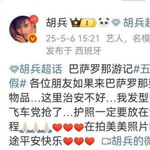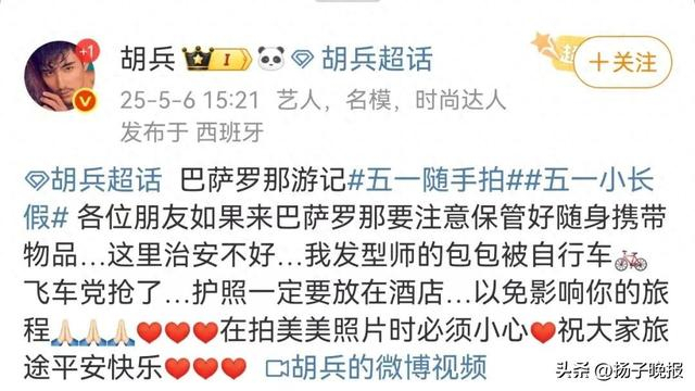 5月6日,演员胡兵在个人社交平台上发文称,“各位朋友如果来巴塞罗那要注意保管好随身携带物品……我发型师的包包被自行车飞车党抢了。”