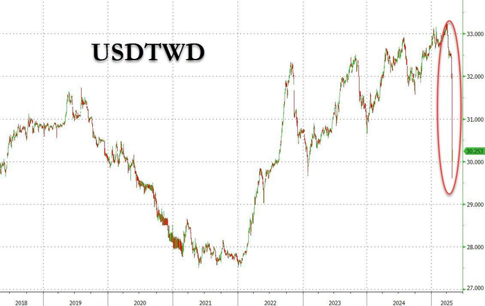 周一,中国台湾新台币兑美元汇率一度升值超过5%,首次自2022年夏季以来突破30台币兑1美元关口。