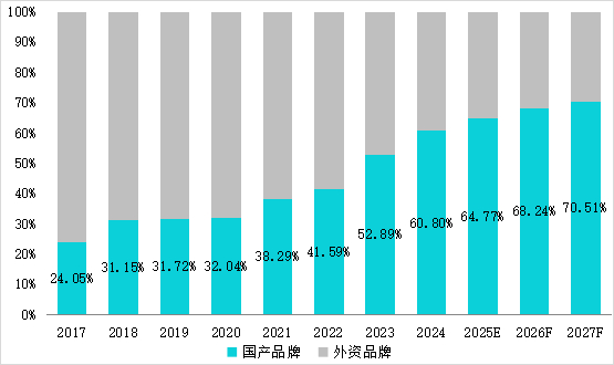 2017-2027年中国工业机器人RV减速器市场内外资份额变化及预测(单位:%)