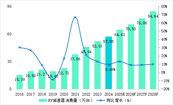 2016-2028年中国工业机器人用RV减速器消费量及预测(单位:万台)