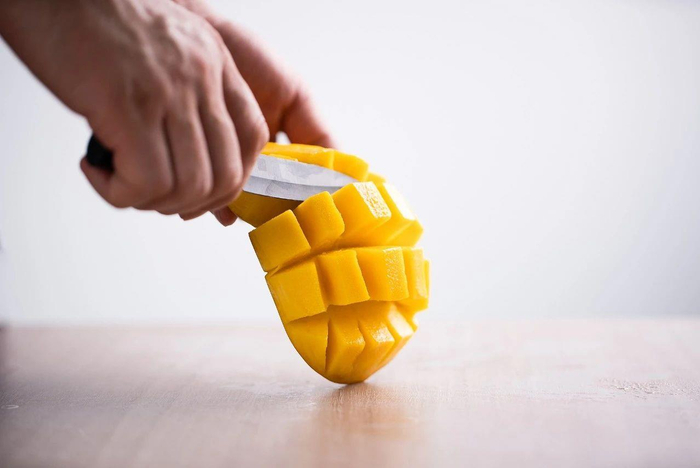 - 第二步:将芒果果肉用刀划成十字花,把果肉翻出来,用刀削下来吃;或者直接用勺子挖着吃。