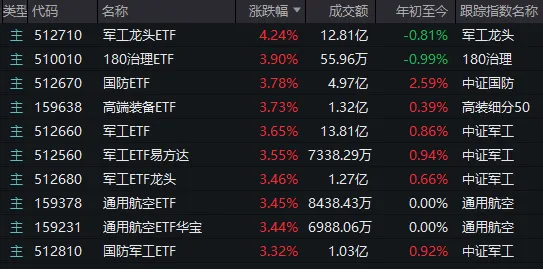而场内ETF中,军工龙头、国防、高端装备、通用航空等多个相关主题产品,也纷纷登上涨幅榜。