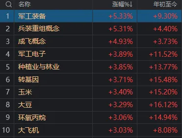 板块来看,军工装备、兵装重组概念、成飞概念、军工电子、大飞机等多个概念涨幅领先。