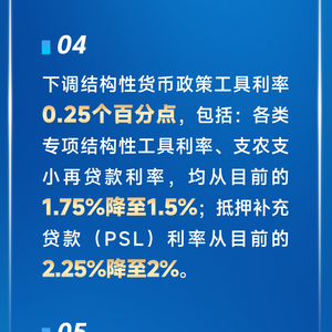 下调结构性货币政策工具利率0.25个百分点,包括:各类专项结构性工具利率、支农支小再贷款利率,均从目前的1.75%降至1.5%;抵押补充贷款(PSL)利率从目前的2.25%降至2%。