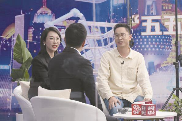 5月1日,拼多多副总裁侯凯笛(左一)与新质商家代表王辉(右一)共同参加拼多多联合中央广播电视总台推出的“五五购物节”专项直播节目 李思轩 摄