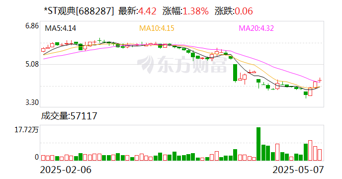 根据《上海证券交易所科创板股票上市规则》第 12.4.2 条第一款,“最近一个会计年度经审计的利润总额、净利润或者扣除非经常性损益后的净利润孰低者为负值且营业收入低于1亿元”,在披露 2024 年年度报告后,观典防务股票被上海证券交易所实施退市风险警示(股票简称前冠以“*ST”字样)。
