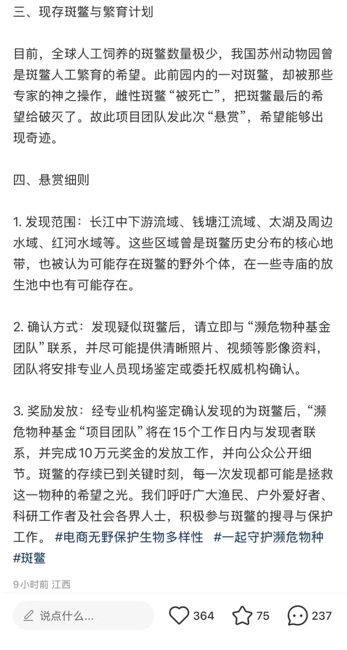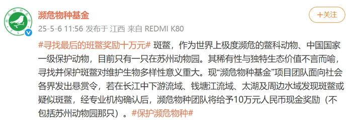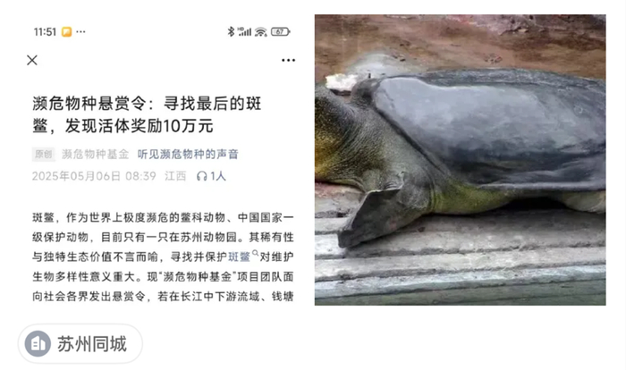 5月6日上午,一则“寻找最后的斑鳖,发现活体奖励10万元”的帖子出现在多个社交平台上并引发关注。其中提到“发现疑似斑鳖后,请立即与‘濒危物种基金团队’联系,并尽可能提供清晰照片、视频等影像资料,团队将安排专业人员现场鉴定或委托权威机构确认。经专业机构鉴定确认发现的为斑鳖后,‘濒危物种基金项目团队’将在15个工作日内与发现者联系,并完成10万元奖金的发放工作,并向公众公开细节。”