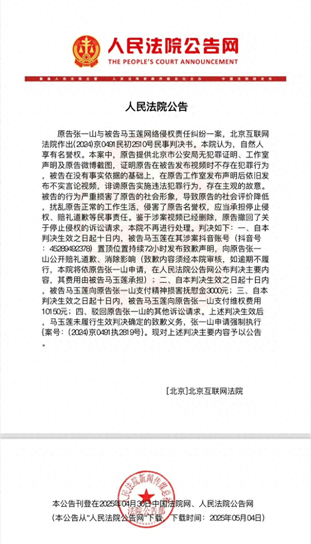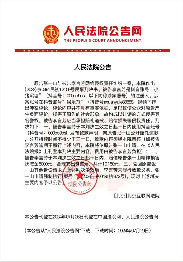 近日,中国广电联合会演员委员会理事张一山在网络侵权纠纷案中胜诉,人民法院公告网发布了相关公告。公告内容显示:原告提供北京市公安局无犯罪证明、工作室声明及原告微博截图,证明原告在被告发布视频时不存在犯罪行为,被告在没有事实依据的基础上,在原告工作室发布声明后依旧发布不实言论视频,诽谤原告实施违法犯罪行为,存在主观的故意。被告的行为严重损害了原告的社会形象,导致原告的社会评价降低,扰乱原告正常的工作生活,侵害了原告名誉权,应当承担停止侵权、赔礼道歉等民事责任。