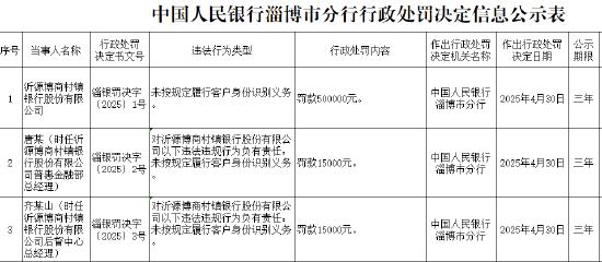 同时,唐某(时任沂源博商村镇银行股份有限公司普惠金融部总经理)因对沂源博商村镇银行股份有限公司未按规定履行客户身份识别义务负有责任,被罚款15000元;齐某(时任沂源博商村镇银行股份有限公司后勤中心总经理)因对沂源博商村镇银行股份有限公司未按规定履行客户身份识别义务负有责任,被罚款15000元。
