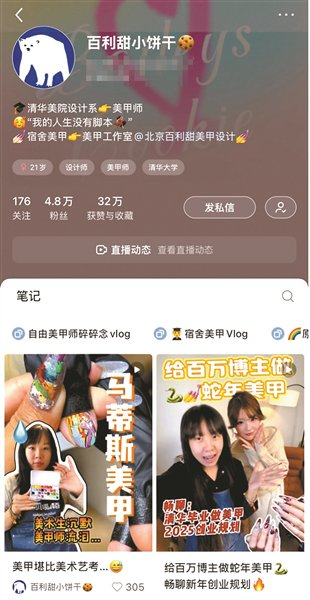 希希在开宿舍美甲店之前,专门在网上浏览了各大北京高校学生的美甲店账号。她发现清华美院毕业的“饼干”,最开始也是在宿舍帮人做美甲,后来慢慢做成了工作室。