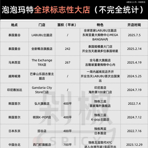 今年,泡泡玛特在泰国曼谷和马来西亚新开设的旗舰店进一步增大面积,均在250平米左右。同时,在曼谷地区,泡泡玛特已经进入了IP的深度运营阶段。去年年初,泡泡玛特曼谷Central Ladprao开设的三号门店,开业时在商场一层打造了CRYBABY特色主题快闪;去年7月,泡泡玛特更是在东南亚最 大的购物中心曼谷MEGA BANGNA,落地了首 个LABUBU主题门店,首日营业额便超过1000万。