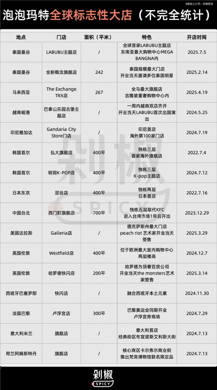 也提供更丰富的体验:除了货品,这些大店多会保留互动体验区供签售、首发、展览、见面会使用…… 一方面,对于国内市场而言,这是泡泡玛特品牌向上的必经阶段。今年一季度财报发布后,泡泡玛特市值冲到2174亿元,在中国上市企业中蹿至70位。截至2024年底,其在内地拥有401家门店,但增长十分克制,2024年只拓店38家。相比大规模扩店,尽可能优化位置、塑造差异化店铺,深化ip影响力,更能提升坪效和收入规模。“首店的概念已不仅限于某个地区的第 一家门店,也包括了城市概念店、形象店、旗舰店等更加富有特色和地标性的门店。在进入城市比较早期的时候,泡泡玛特的部分门店会分布在商场的B1层,随着品牌向上发展,我们会寻找一层门店位置进行入驻。”谈及后续国内发展策略,泡泡玛特如此表示。另一方面,这是泡泡玛特高举高打出海策略下的必然选择。在已经相对扎实的东南亚、东亚市场进行旗舰店和IP店升级,深化ip影响力;在欧美地区核心商圈地标打造大店强化品牌形象,逐个突破,泡泡玛特的旗舰店策略剑指更大的海外市场,目前来看也颇有成效。“今年目标在海外开出100家门店,跟往年不同的是面积更大,位置上会更好,同店表现会比往年好。”一季度电话会上,泡泡玛特如此表示。