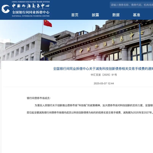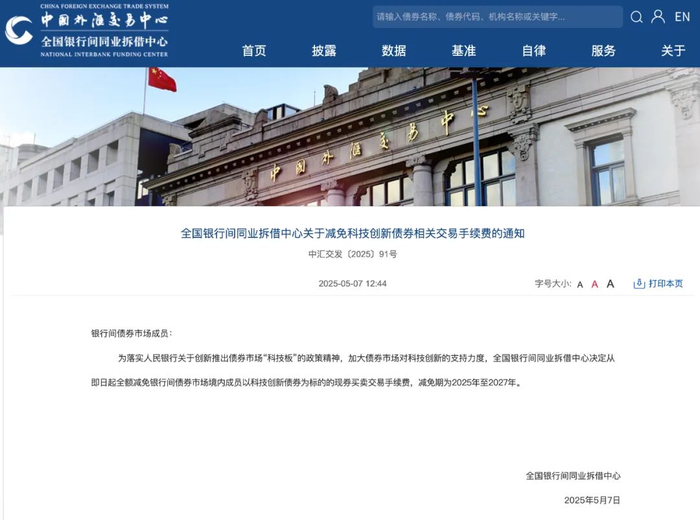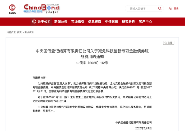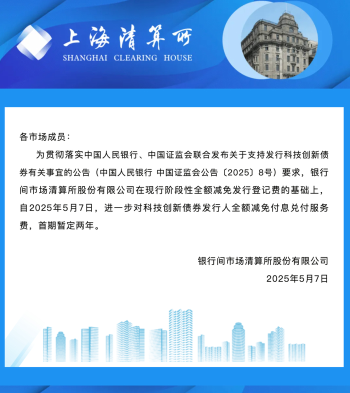 银行间市场清算所股份有限公司发布关于全额减免科技创新债券发行人有关费用的通知,决定在现行阶段性全额减免发行登记费的基础上,自2025年5月7日,进一步对科技创新债券发行人全额减免付息兑付服务费,首期暂定两年。