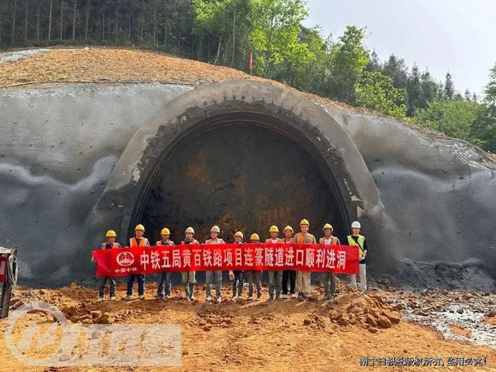 近日,贵州黄桶至广西百色铁路(以下简称黄百铁路)广西段连篆隧道开始掘进施工,隧道工程建设保持稳步推进。