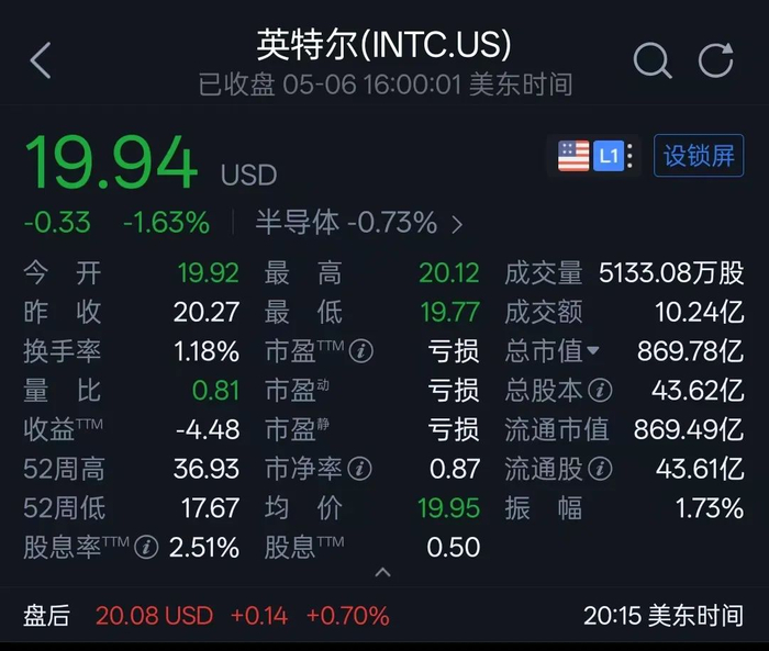 就像当年英特尔选择了X86架构,AMD选择的ARM架构,早期的英特尔似乎是领先的,但今天的高性能且低发热的芯片,如苹果的M系列芯片,都是采用的ARM架构,而曾经在技术路线上领先的英特尔,却似乎在被市场淘汰中,业绩上不断亏损,CEO一换再换,股价一跌再跌。截至美东时间5月6日收盘,英特尔的收盘价格为19.94美元,总市值也只剩下869.78亿美元。