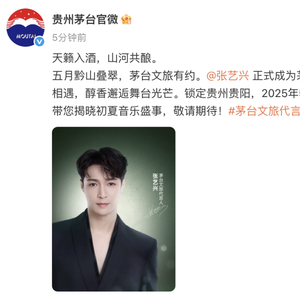 5月7日,贵州茅台官方号宣布:“张艺兴正式成为茅台文旅代言人,传统与潮流相遇,醇香邂逅舞台光芒”。