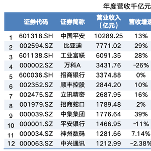 以营业收入为标准,除平安银行被中集集团超越、中兴通讯被神州数码超越外,其余10家企业排名与2023年一致。中国平安(601318.SH)、比亚迪(002594.SZ)、工业富联(601138.SH)稳居营收前三,且均实现两位数增长。