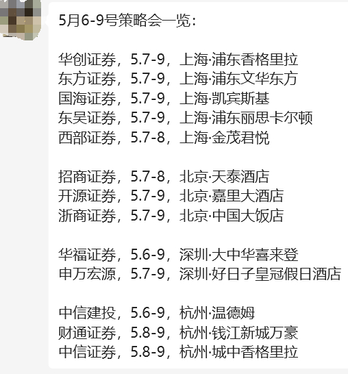 5月及之后的数个月,是券商研究所会议举行高峰期,尤其是中期策略会召开较多。为避免“撞车”,券商工作人员互相打听各家券商会议举办情况。一位券商研究所工作人员向记者展示了一份清单,展示近期券商研究所会议举办时间与地点。